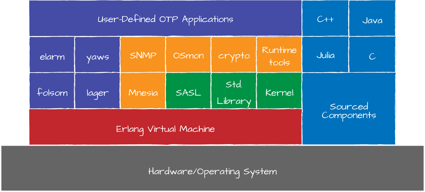 An Erlang node typically consists of a number of loosely coupled OTP applications that interact with each other. OTP applications come from a variety of sources: