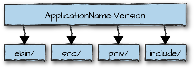 Applications are packaged in a directory that follows a special structure and naming convention. Tools depend on this structure, as do the release-handling mechanisms. A typical application directory has the structure shown in Figure 9-3, containing the ebin, src, priv, and include directories.