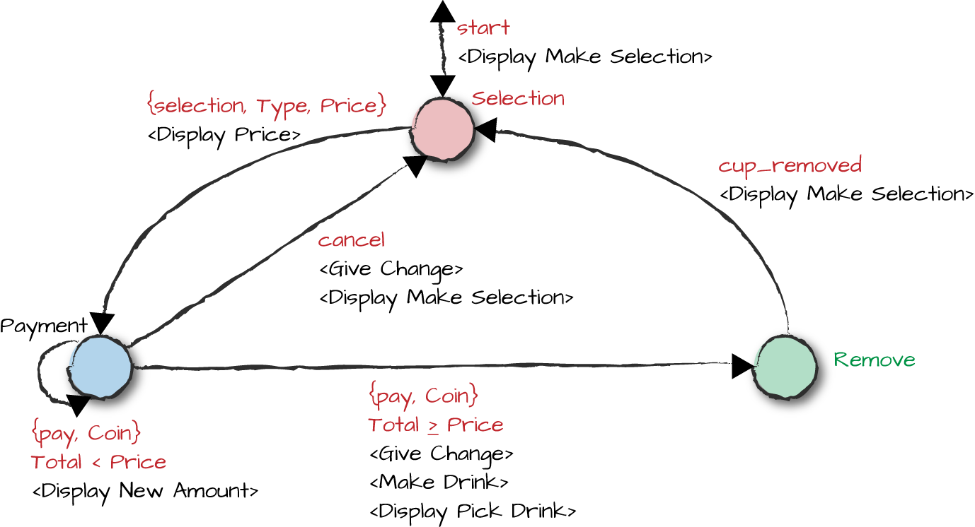 We’ve opted to keep the example simple, but could have easily inserted locks in the hardware by upgrading hw.erl to add the functions hw:lock() and hw:unlock(). These would represent safeguards that would ensure that the coffee machine door could be opened only in the selection state and would keep it locked when the machine is in other states.