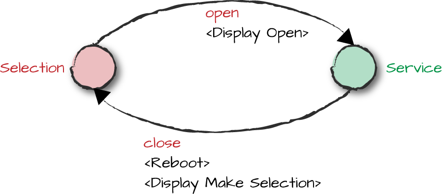 The service state ignores all events except for users inserting coins and the closing of the coffee machine door. Upon closing the door, the hardware is rebooted and the display instructs the customer to make a selection. The open and close events are ignored in all other states: