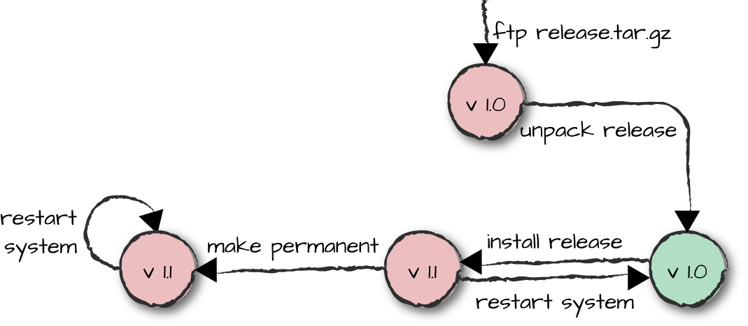 In order to upgrade a target system, you need to start with a baseline installation. It will usually be the first release, the one you created manually. Unless you were using rebar3, it has to be a manual task, because most of the release-upgrade tools are written in Erlang and will not run without your baseline system. It’s a classic chicken-and-egg problem.