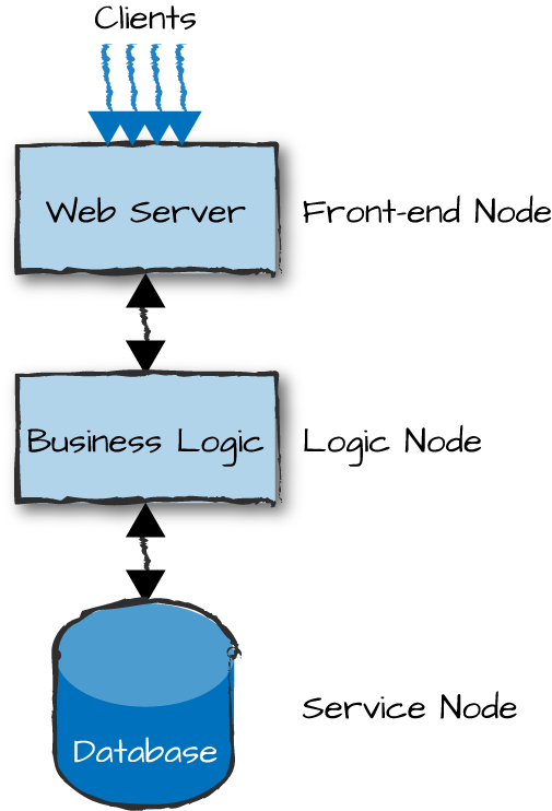 The web server node is what we refer to as a front-end node. Front-end nodes are responsible for providing external connectivity to clients and handling all incoming requests. They act as gateways, keeping client connections open as needed, formatting inbound requests and outbound responses, and passing the requests onward to the nodes handling the business logic. They are part of the server-side software, serving, but not running, the presentation layer.