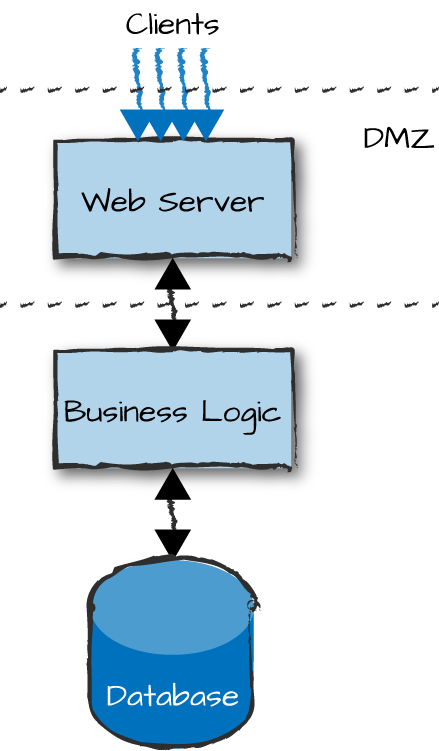 Demonstrating networking choices with our example will help clarify the choices you have to make. If you are concerned about security in your e-commerce site, you might want to place your front-end nodes in a demilitarized zone (DMZ), also known as a perimeter network (Figure 13-2). This is a physical or logical part of the network that exposes your nodes to an untrusted network (i.e., the Internet) used by the clients to access your services. DMZs were traditionally implemented in the hardware through the arrangement of managed network elements, and in the software using firewalls and other security measures. In cloud computing environments you do not get the hardware component, and have to instead mimic it through network connections and firewall rules. The end result, however, is still the same. By creating an additional layer of security around your back-end nodes, you reduce the risk of intrusion in your logical and service nodes by not exposing their interfaces.